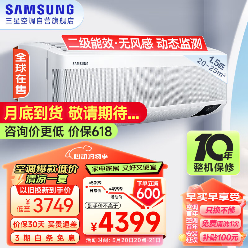 三星空调1.5匹新二级能效全直流变频无风感WIFI除菌冷暖壁挂式挂机20-25㎡适用以旧换新AR12TSCAAWKNSC价格:4999.00元!