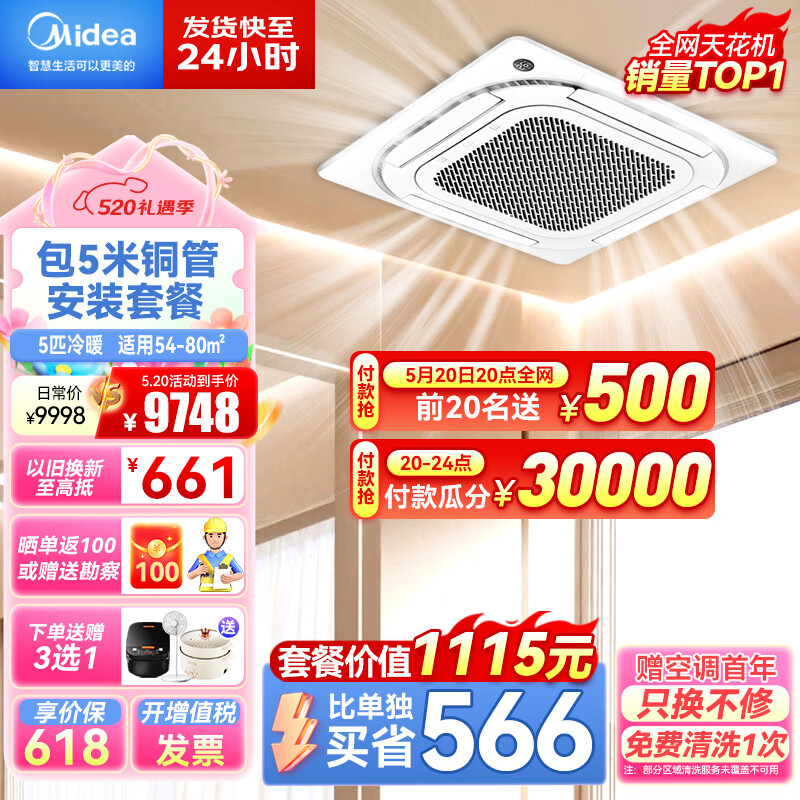 美的(Midea)5匹天花机空调吸顶吊顶空调 商用中央空调嵌入式一拖一380v 包5米铜管安装RFD-120QW/BSDN8Y-D(B3)价格:9998.00元!