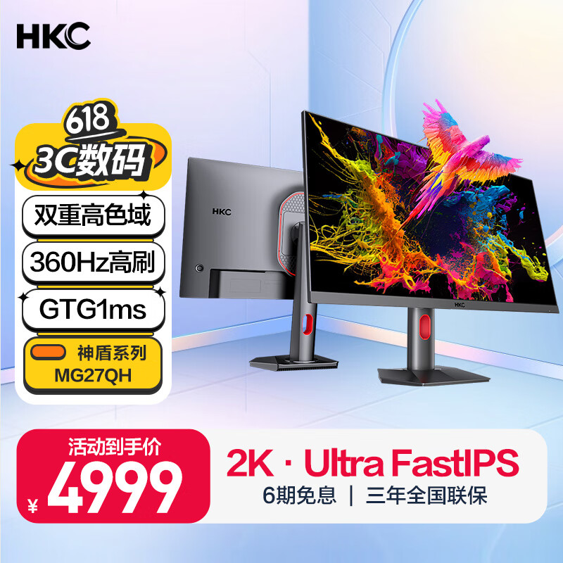 HKC 27英寸 2K 360Hz Ultra Fast IPS 1ms响应HDR600广色域10bit屏幕 旋转升降游戏电竞显示器 MG27QH价格:6499.00元!