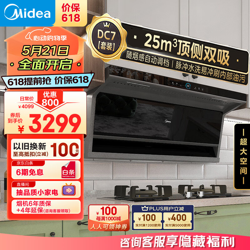 美的(Midea))抽油烟机 燃气灶具 家用顶侧双吸大吸力 高压水洗 变频排烟机 新静吸烟灶套装DC7+Q70A天然气价格:3599.00元!