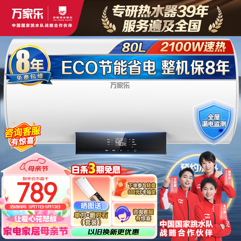 万家乐电热水器80升 储水式ECO节能速热 2100W触控大屏 预约加热 高温灭菌D80-CY3价格:889.00元!