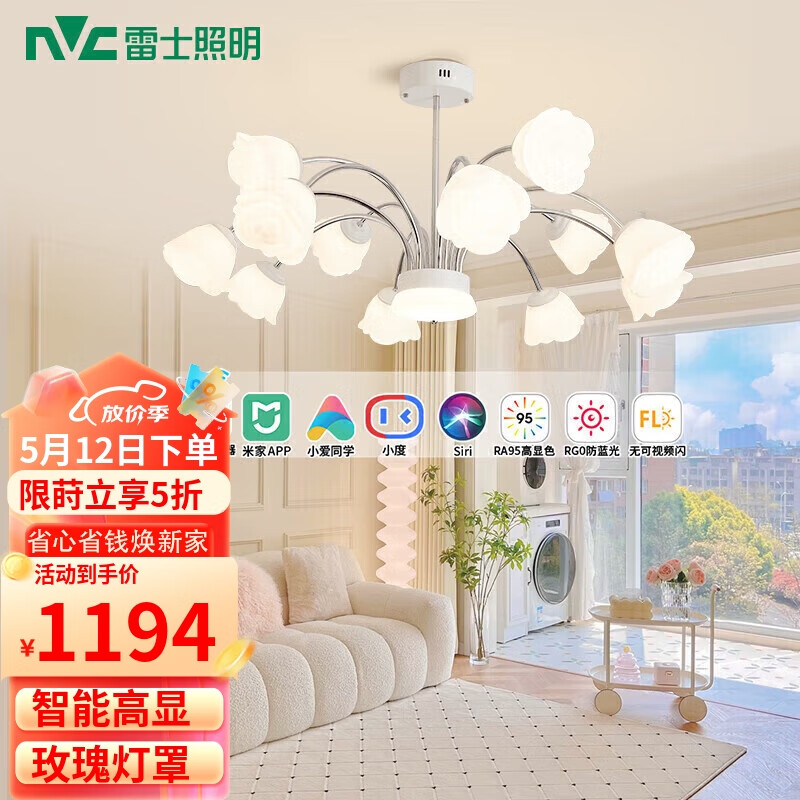 雷士(NVC)奶油法式浪漫花玫瑰灯罩客厅灯智能舒适光12头吊灯WHDD120F/G-13价格:2388.00元!