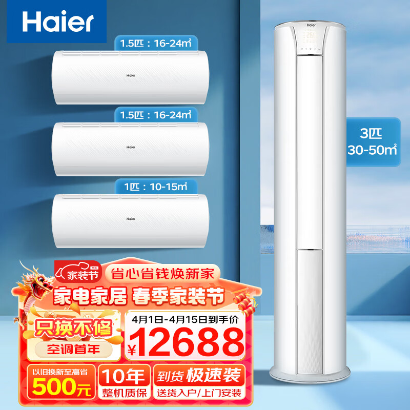 海尔(Haier)空调套装三室一厅新一级能效变频家用APP智控自清洁(大1匹+1.5匹挂机*2+3匹柜机) 以旧换新价格:12688.00元!