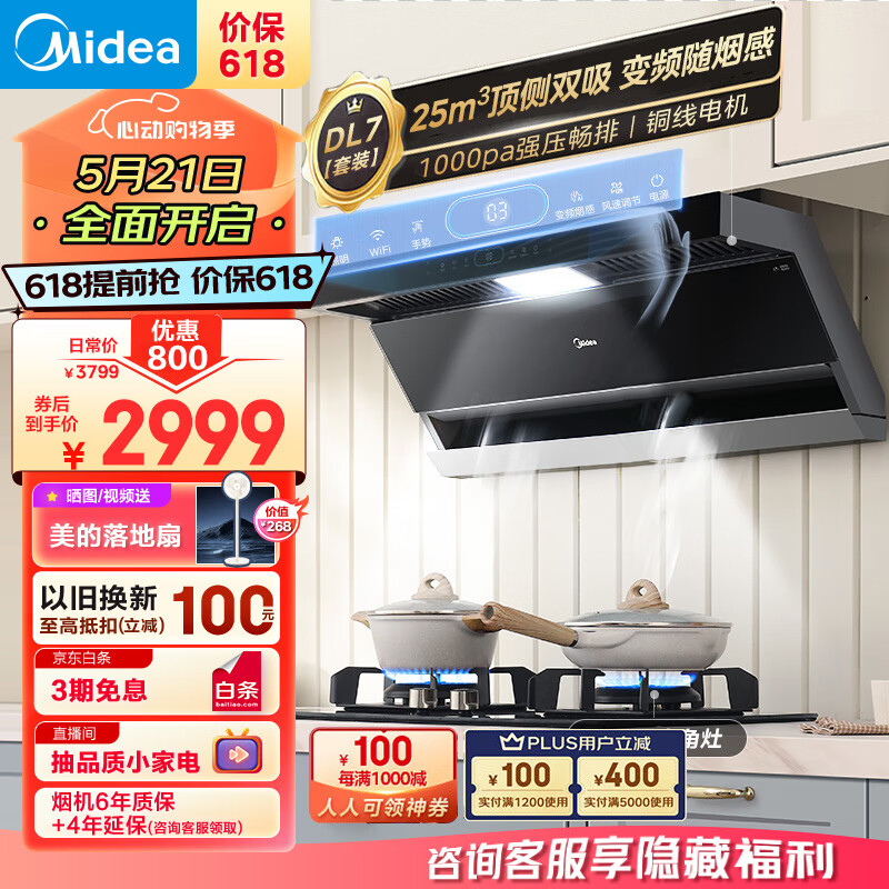 美的(Midea)抽油烟机燃气灶具家用顶侧双吸25风量大吸力变频烟感 7字型排烟机烟灶套装DL7+Q70A天然气价格:3299.00元!