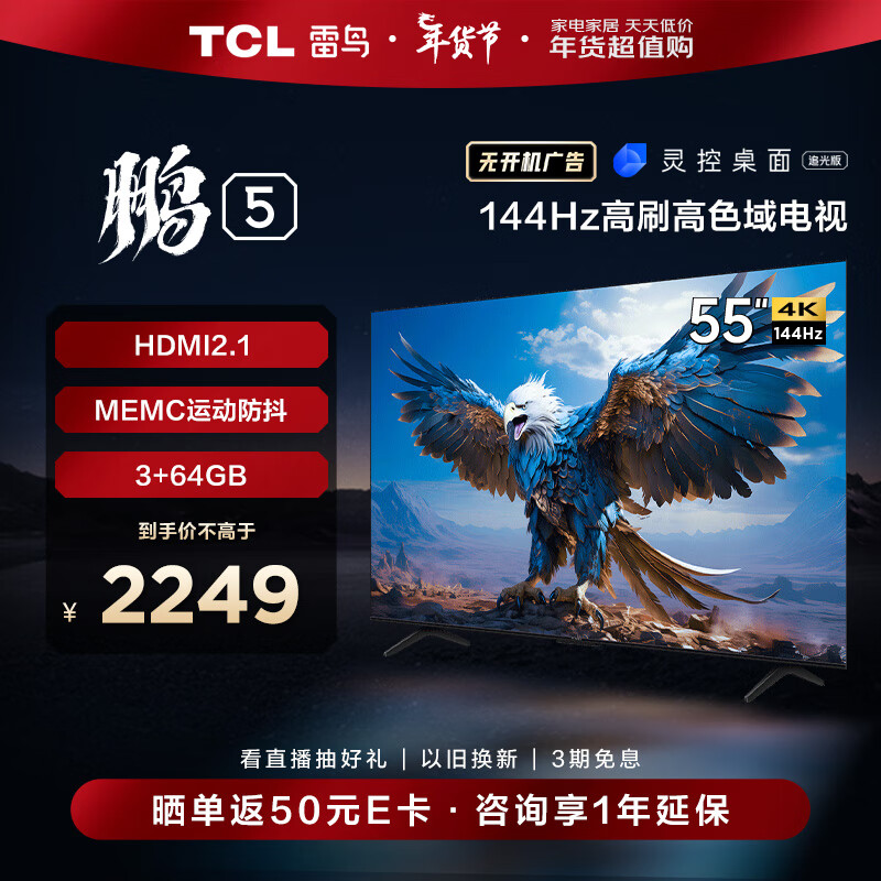 TCL雷鸟 鹏5系 55英寸 游戏电视 144Hz高刷 屏 HDMI2.1 3+64G 智能液晶平板电视机新55S515D价格:2249.00元!