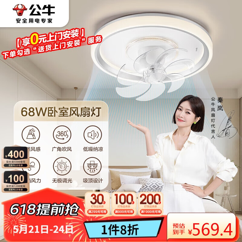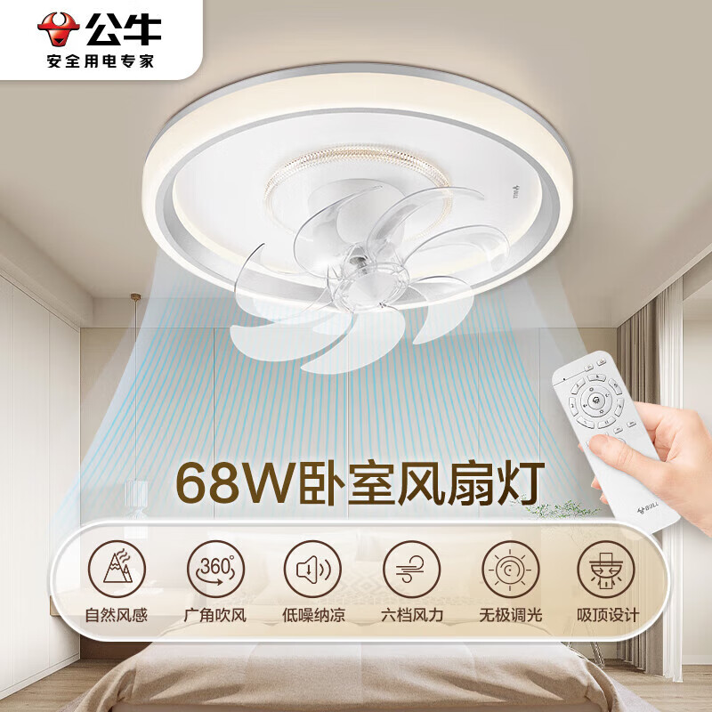 公牛(BULL)卧室风扇灯GF08BZ自然风360°灵活摇头六档风力无极调光68W带遥控价格:711.75元!