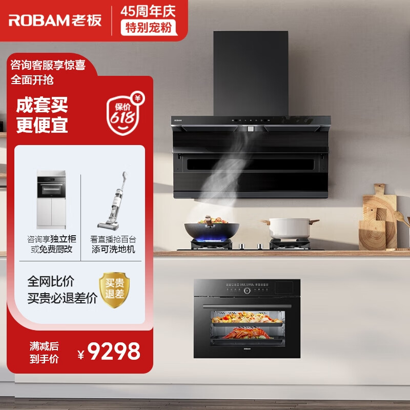 老板(Robam)小黑翼家用顶侧双吸抽油烟机大吸力25风量顶侧油烟机蒸烤一体机厨房多件套D1+57B2DT+CQ9062D价格:10498.00元!