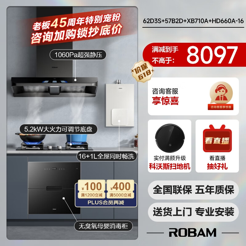 老板(Robam)抽油烟机厨房多件套 钢琴家D3S欧式24风量燃气灶具消毒柜热水器62D3S+57B2DT+XB710A+HD660A-16价格:8897.00元!