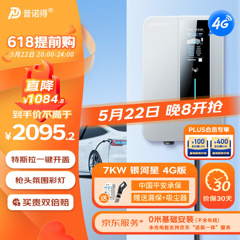 普诺得银河星4G版 7KW新能源电动汽车家用充电桩 适配于特斯拉比亚迪小鹏充电器送装一体含基础安装价格:2642.50元!