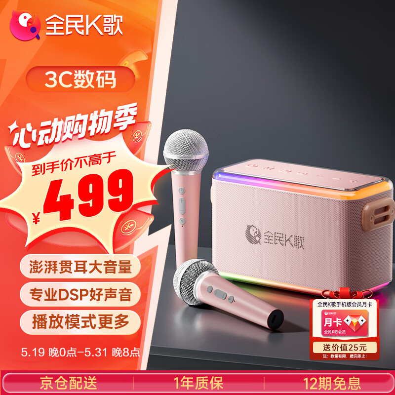 K歌K歌 便携式无线K歌音箱麦克风套装 超长续航家用KTV户外娱乐话筒音响一体V53粉色价格:499.00元!
