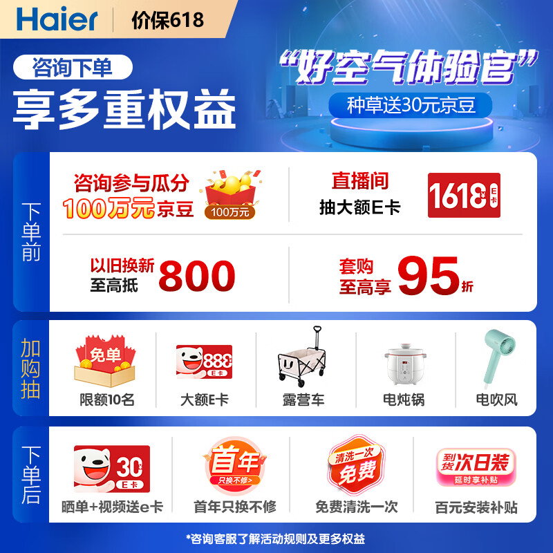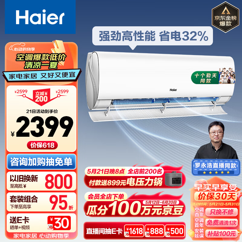 海尔(Haier)劲爽 1.5匹新一级变频 冷暖 壁挂式空调挂机 冷媒变流 KFR-35GW/B5LAA81U1以旧换新价格:2399.00元!