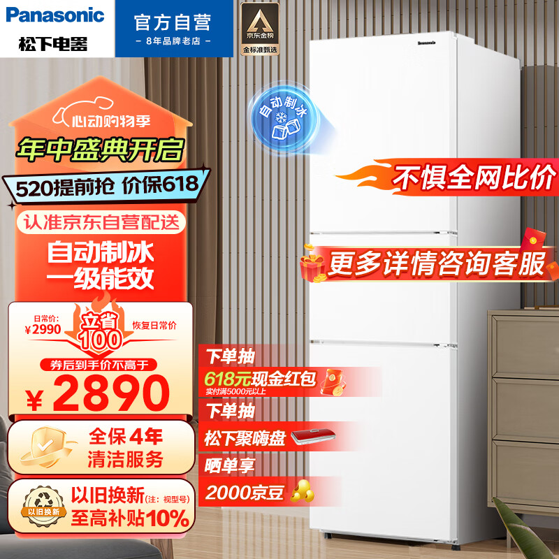 松下(Panasonic)303升家用三门冰箱京小家智能生态一级能效 自动制冰 风冷无霜 磨砂白色NR-JS30AX1-W价格:3290.00元!