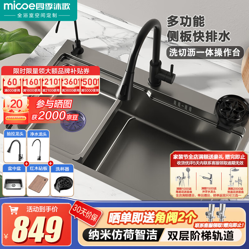 四季沐歌厨房水槽洗菜盆大单槽纳米304不锈钢一体洗碗台下盆多功能阶梯式价格:1049.00元!
