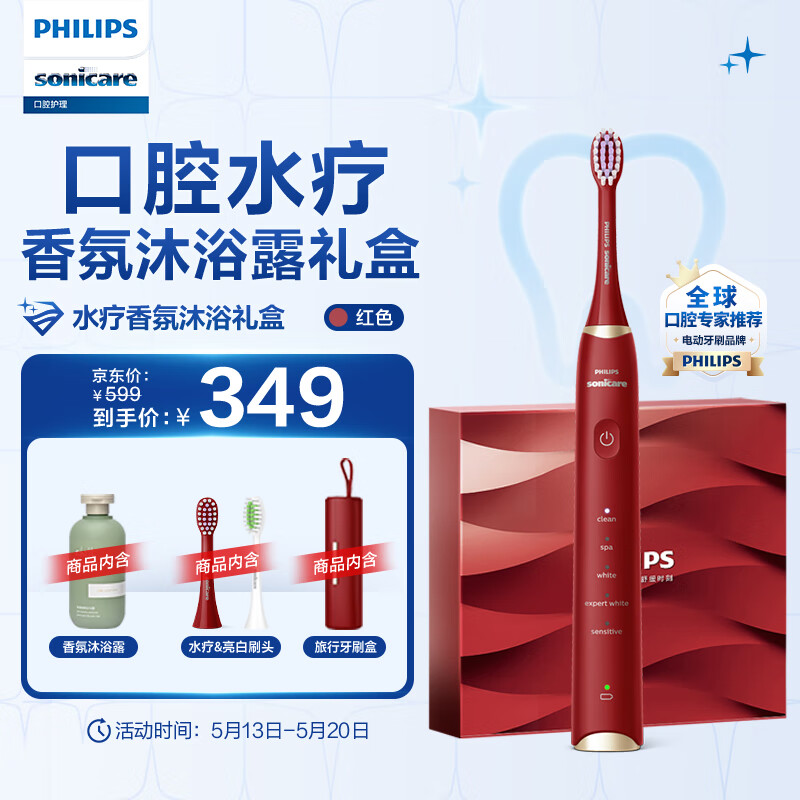 飞利浦(PHILIPS)电动牙刷成人 520情侣送男/女友 母亲节礼物 S5系列SPA级声波震动5种模式红色HX2491/02BP礼盒款价格:399.00元!