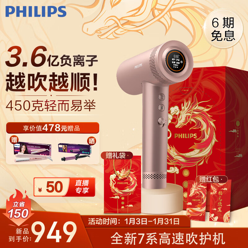 飞利浦(PHILIPS)高速电吹风机 3.6亿负离子 头皮柔护科技 家用速干护发 礼物推荐 鎏金筒BHD737/05水光粉价格:949.00元!