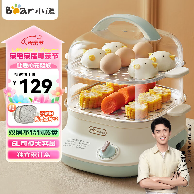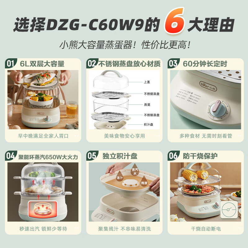 小熊(Bear)煮蛋器 电蒸锅 大容量蒸蛋器 多功能双层不锈钢蒸盘 自动断电早餐蒸煮一体机DZG-C60W9价格:129.00元!