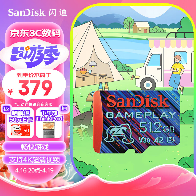 闪迪(SanDisk)512GB TF 存储卡U3 V30 4K游戏内存卡 读速190MB/s 写速130MB/s 游戏不卡顿 手机掌机专用价格:379.00元!