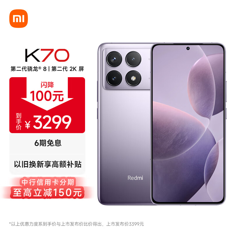 小米Redmi K70 第二代骁龙8 澎湃OS 16GB+1T浅茄紫 红米5G手机 SU7 小米汽车互联 AI手机价格:3299.00元!
