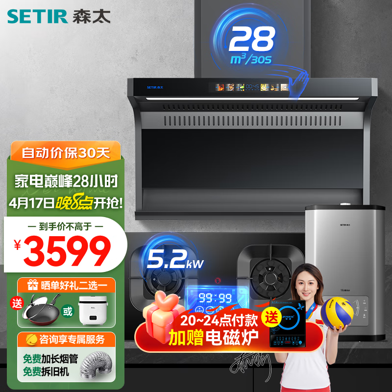 森太(SETIR)油烟机灶具燃热套装 顶侧双吸抽油烟机家用28风量变频智能巡航 烟灶热三件套B929+TM81+C36 天然气价格:3899.00元!