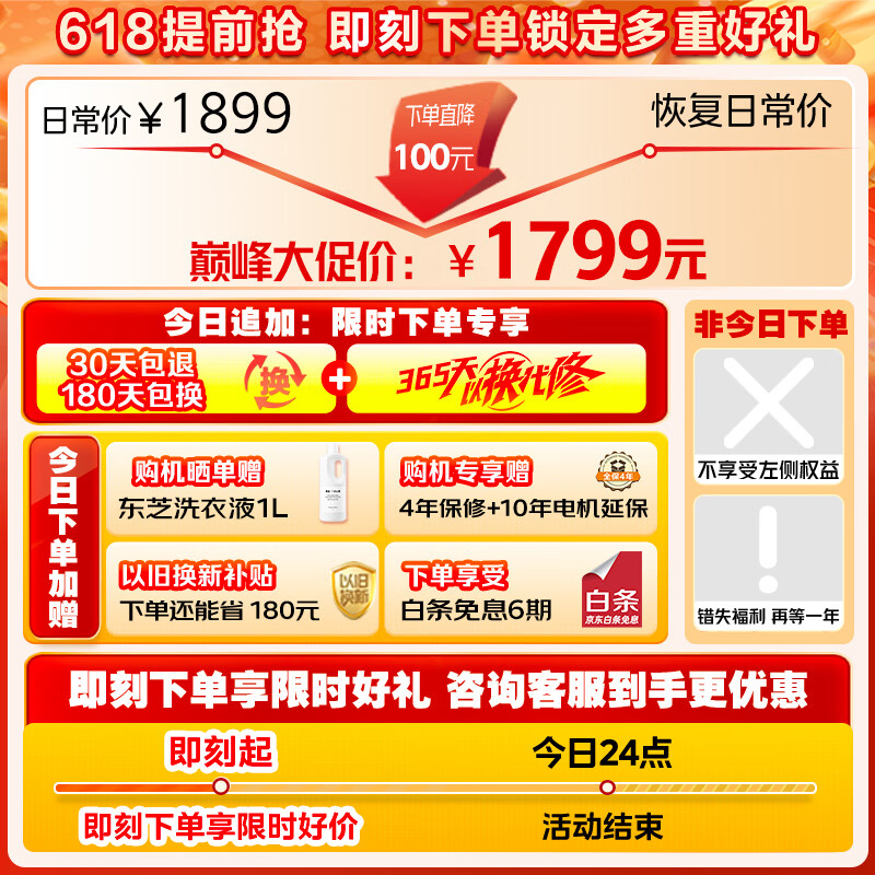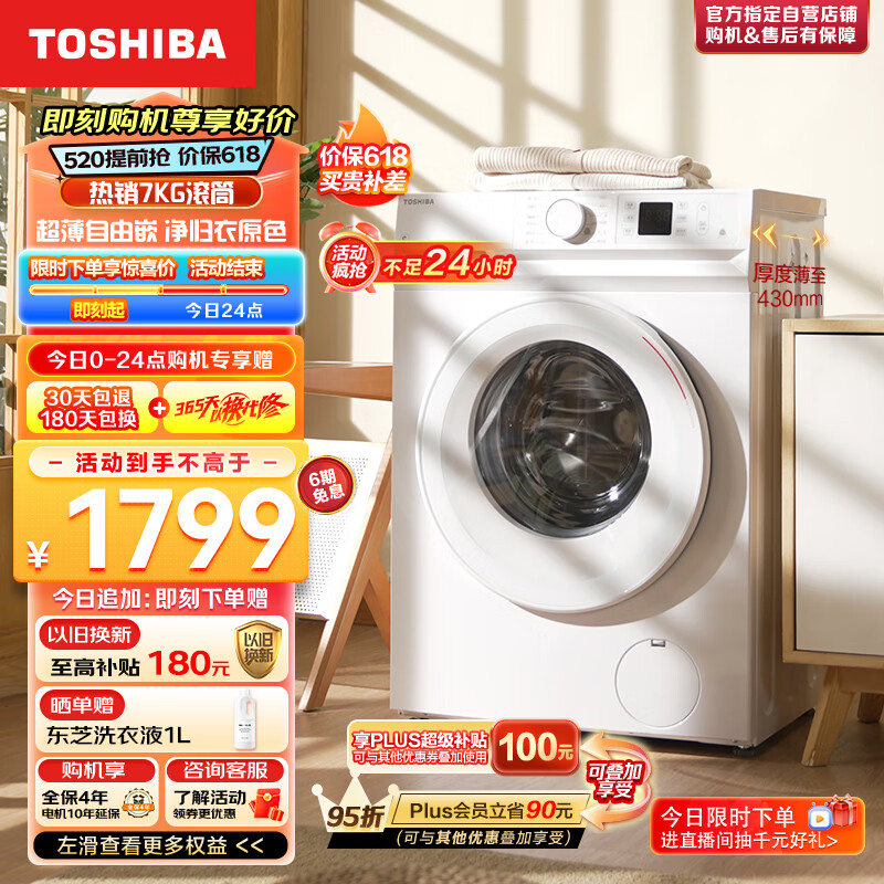 东芝(TOSHIBA)滚筒洗衣机全自动 7公斤超薄洗衣机 BLDC变频电机 小户型家用 健康除螨 以旧换新 DG-7T11B价格:1799.00元!