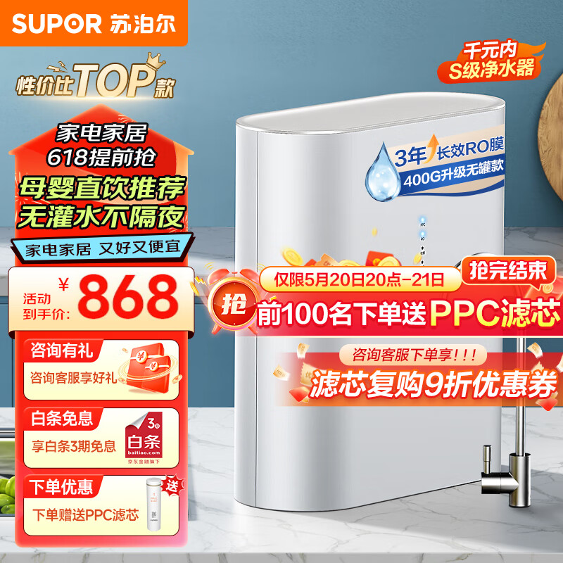 苏泊尔(SUPOR)净水器家用直饮机净水机RO反渗透纯水机400G大通量过滤器DR40滤水器台下软水机厨下厨房价格:868.00元!