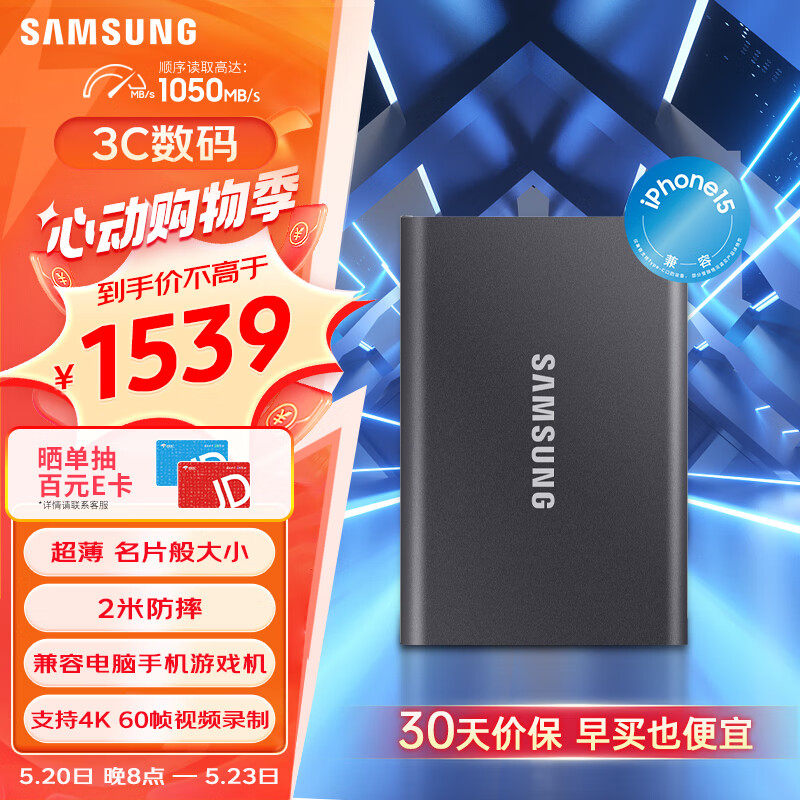 三星(SAMSUNG) 2TB Type-c USB 3.2 移动固态硬盘(PSSD) T7 灰色 NVMe传输速度1050MB/s 超薄时尚价格:1539.00元!