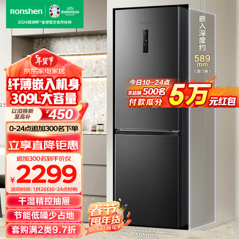 容声(Ronshen)309升两门双开门家用风冷无霜节能低噪冰箱纤薄大容量BCD-309WRS1DE干湿精储大冷冻空间价格:2299.00元!