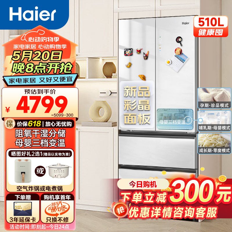 海尔(Haier)510升大容量法式多门四开门家用电冰箱 全新彩晶面板 超薄嵌入式 变频无霜三档变温净味价格:4799.00元!