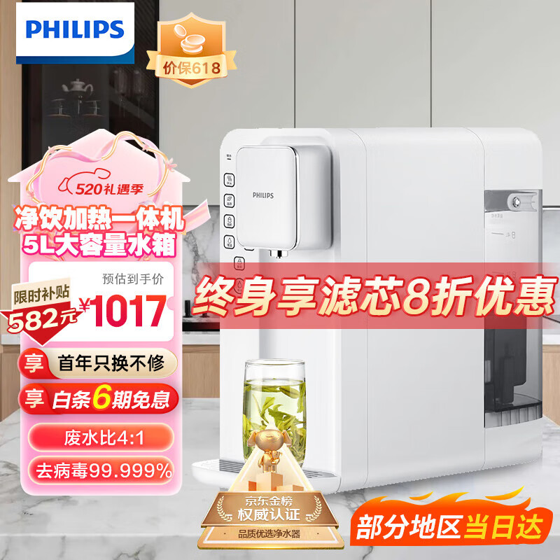 飞利浦(PHILIPS)净水器家用 净水器加热直饮一体机 台式免安装即热直饮水机 RO反渗透净水器双芯5L大水箱ADD6812 家庭款价格:1017.00元!
