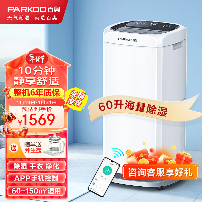 百奥(PARKOO)除湿机/抽湿机 除湿量60升/天 App控制 空气净化 家用地下室复式别墅商用工业吸湿器 PD602AR价格:1743.00元!