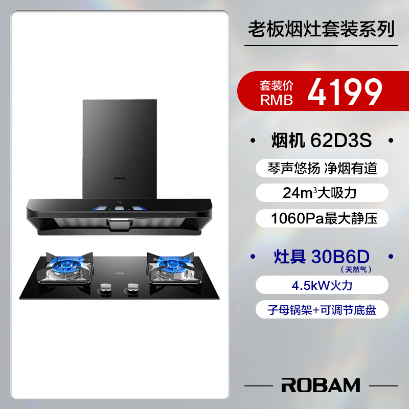 老板(Robam)抽油烟机 钢琴家D3S欧式24风量变频家用燃气灶吸油烟机灶具套装62D3S+30B6D(天然气)价格:4199.00元!