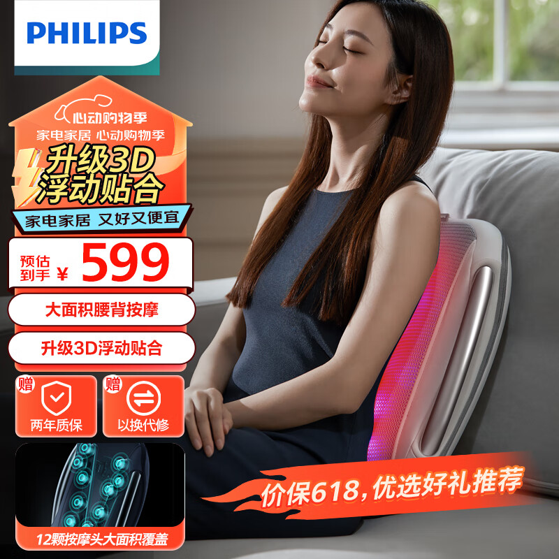 飞利浦(PHILIPS)腰部按摩器 背部按摩仪 多功能腰椎揉捏热敷腰肌劳损按摩仪靠垫靠枕送男女友520礼品5101B 灰色价格:977.00元!