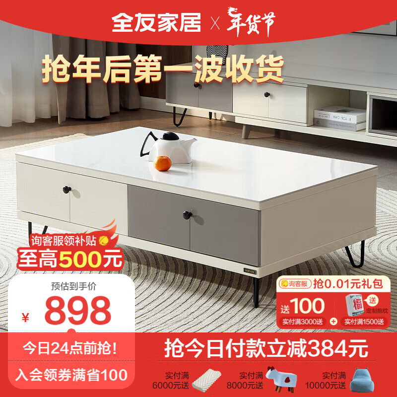 全友家居 现代简约灰白双色地柜岩板台面茶几小户型客厅家具120797A价格:1282.86元!