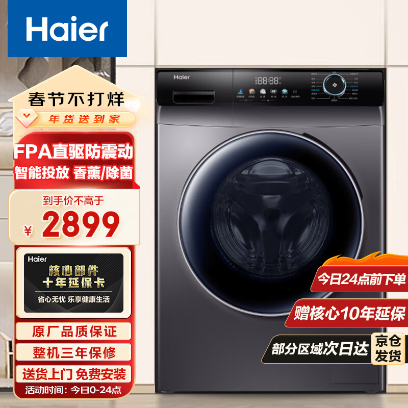 海尔(Haier)10KG滚筒洗衣机全自动直驱变频一级能效家用大容量香薰/巴氏除菌智能投放+摇篮柔洗EG10012BD55S价格:2899.00元!