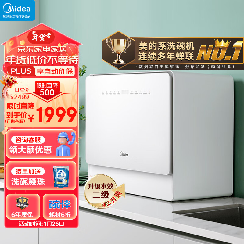 美的(Midea)5套 洗碗机台式 UP2(极地)升级二级水效 高温除菌 85℃热风烘干 三旋劲洗 双层碗篮 水果海鲜洗价格:2499.00元!