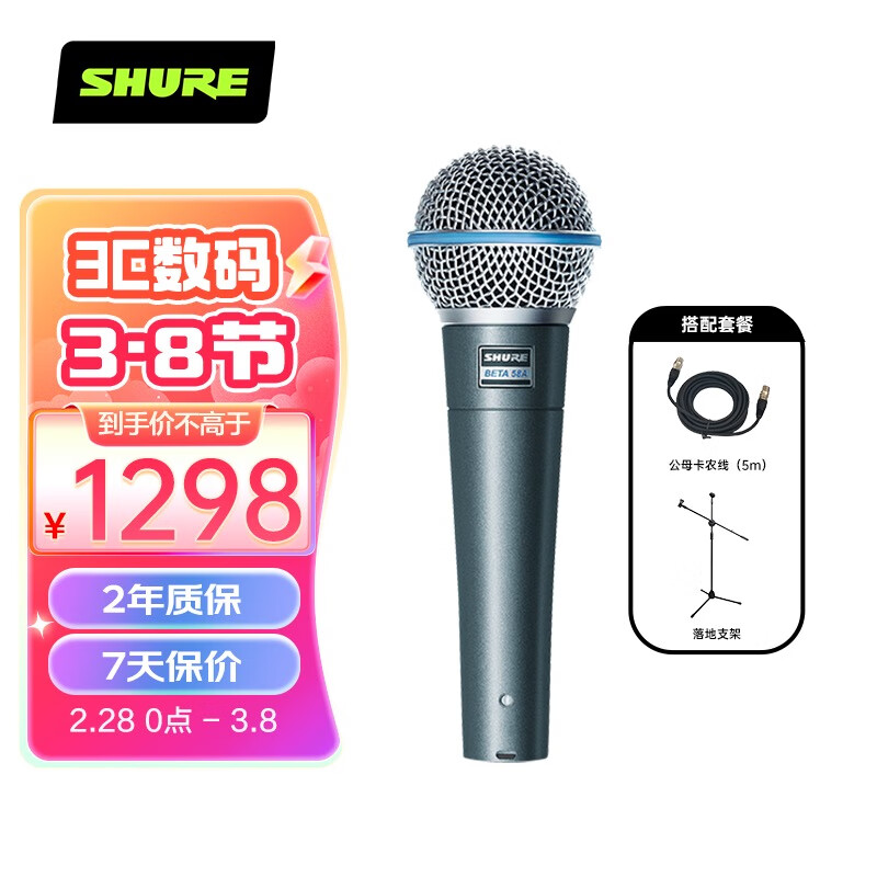 SHURE BETA 58A专业动圈有线话筒家用K歌直播舞台演出麦克风BETA58A+卡农线(5米)+落地支架价格:1298.00元!