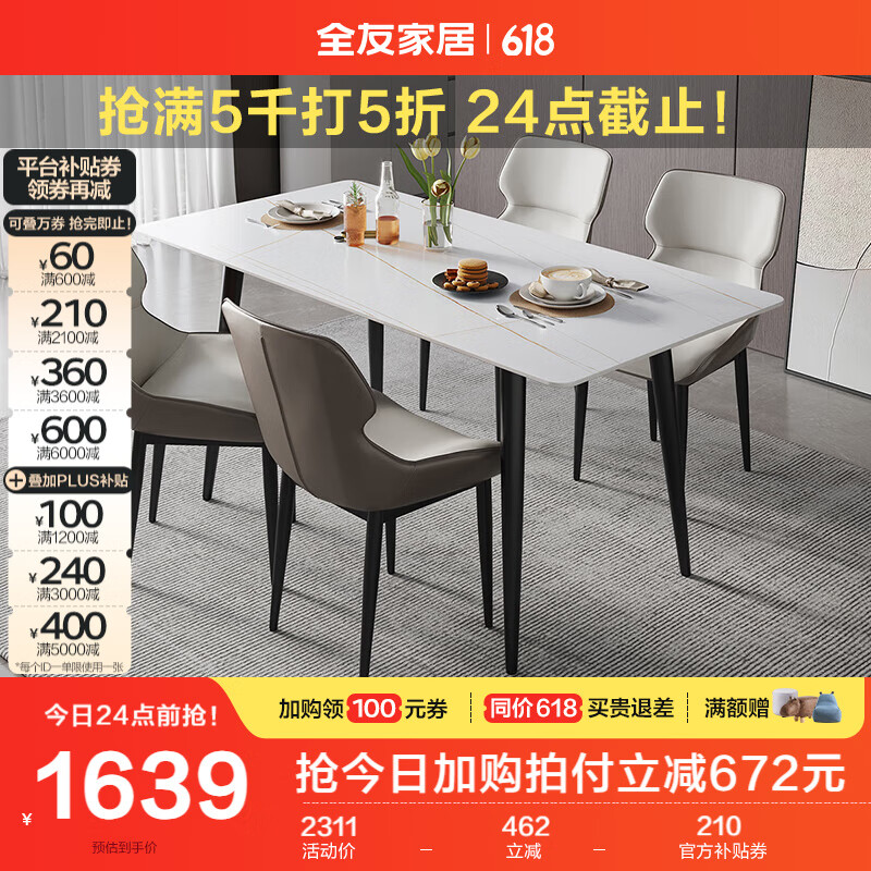 全友家居岩板餐桌家用轻奢现代简约餐桌椅饭桌小户型餐桌价格:2311.25元!