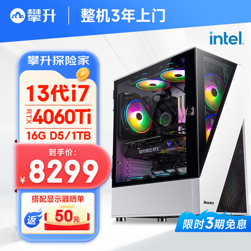 攀升探险家13代i7 13700F/RTX4060Ti/华硕B760/1T固态/16G D5电竞游戏台式电脑主机全套整机diy组装机价格:8899.00元!