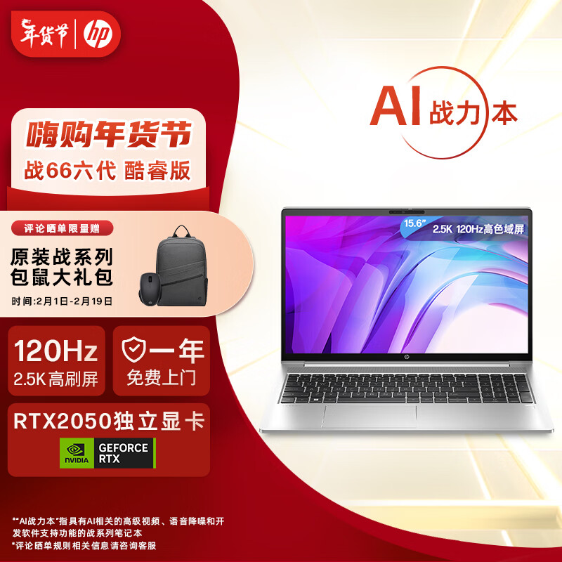 惠普(HP)战66六代酷睿15.6英寸轻薄笔记本电脑(英特尔13代高性能i5 32G 1T RTX2050 2.5K120Hz AI一年上门)价格:6299.00元!