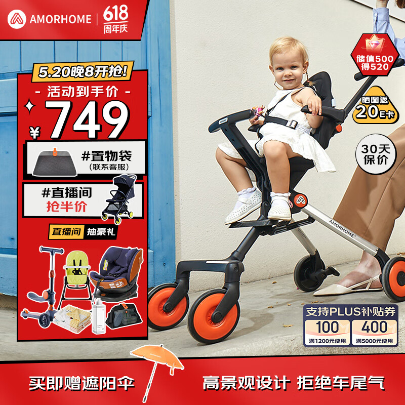 AMORHOME遛娃神器婴儿推车1-3岁可坐可躺轻便折叠宝宝溜娃 折叠小易收橘色价格:980.00元!
