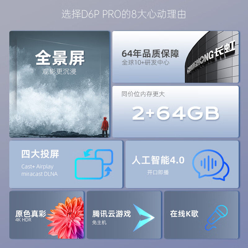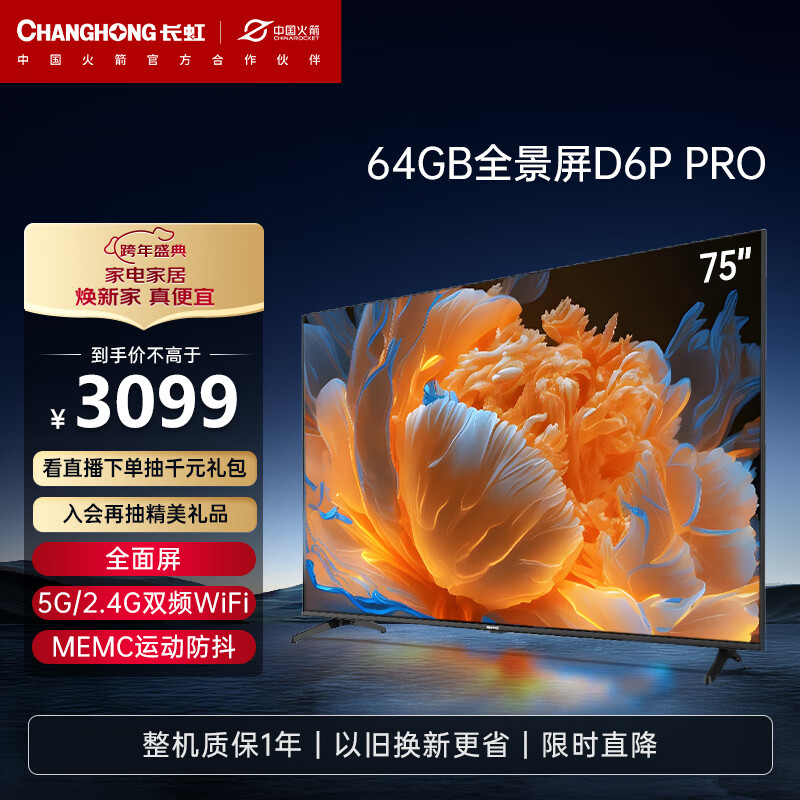 长虹电视75D6P PRO 75英寸2+64GB超大内存 MEMC 远场语音 4K超高清屏 平板LED液晶电视机价格:5599.00元!