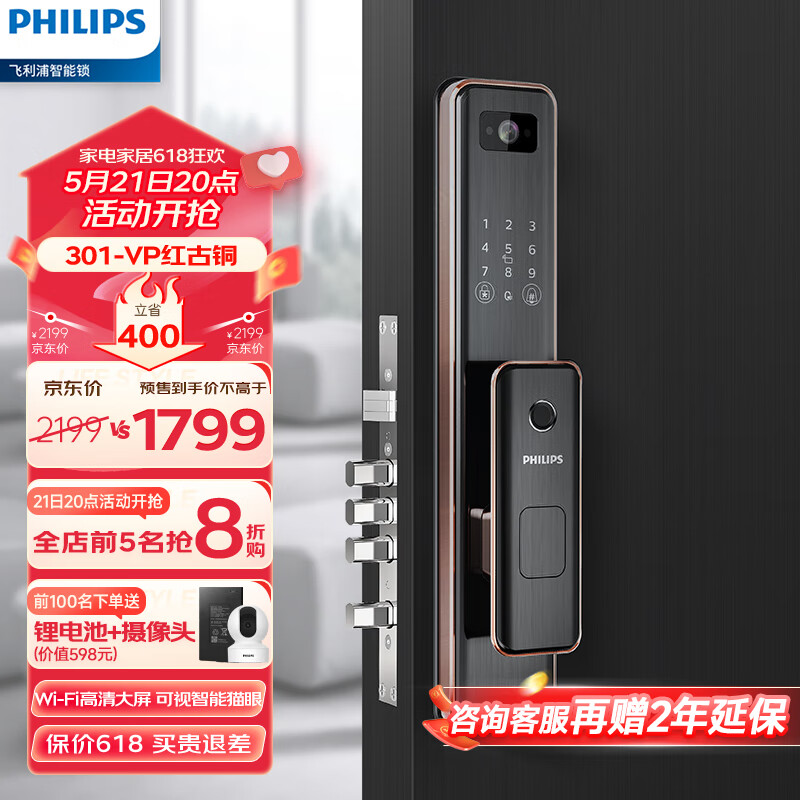 飞利浦(PHILIPS)智能锁301 智能门锁 指纹锁 可视猫眼大屏密码锁防盗门锁WIFI智联 301VP-红古铜(大屏+猫眼)价格:2199.00元!