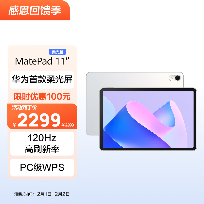 HUAWEI MatePad 11英寸2023款柔光版华为平板电脑120Hz高刷2.5K护眼屏娱乐学习 8+128GB WIFI 晶钻白价格:2299.00元!