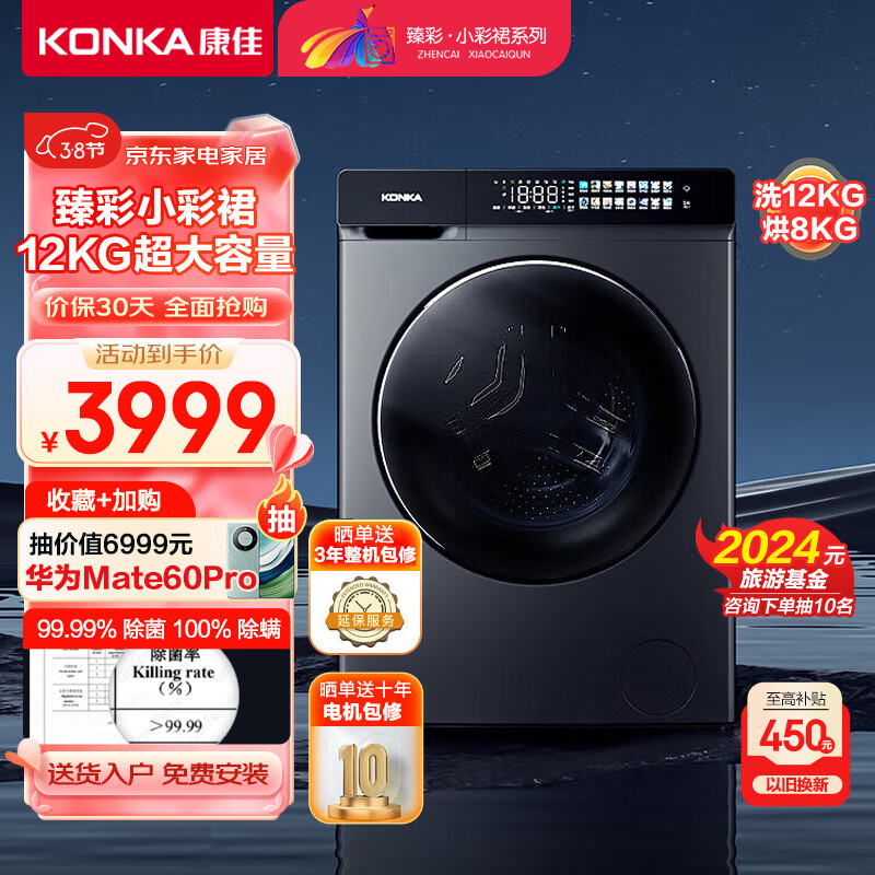康佳(KONKA)滚筒洗衣机全自动 臻彩小彩裙 12KG洗烘一体 巴氏除菌 彩色触控大屏 1.08洗净比 KH120-1401BACJQT价格:3999.00元!