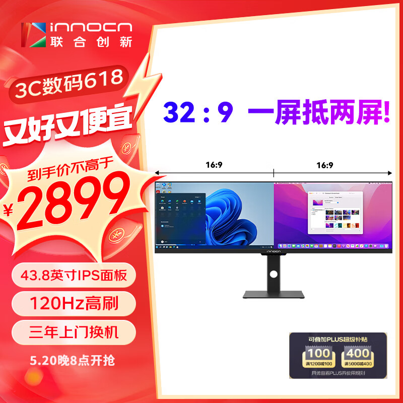 联合创新(INNOCN)43.8英寸32:9 IPS带鱼屏120Hz HDR400 Type-C65W 10Bit专业校色 设计剪辑电脑显示器44C1G价格:2999.00元!