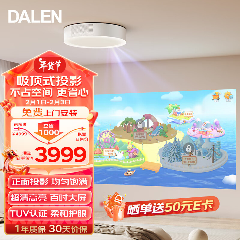 达伦阿拉丁神灯投影仪家用投影机吸顶投影仪正向投影超高清低蓝光画面亲子教育鸿蒙智联X30 价格:4999.00元!