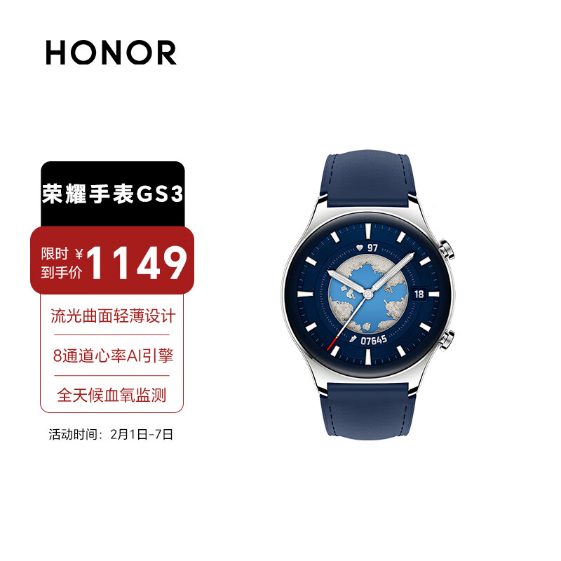 荣耀手表GS 3 环球远航智能轻奢手表14天强劲续航8通道心率AI引擎100+运动模式 龙年表盘新年礼物价格:1149.00元!