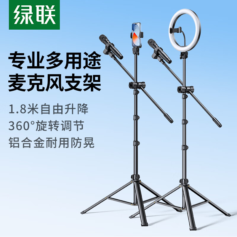 绿联 麦克风话筒三脚架落地支架话筒架 麦架落地压杆伸缩三脚架录音舞台支架设备配架咪夹价格:109.00元!