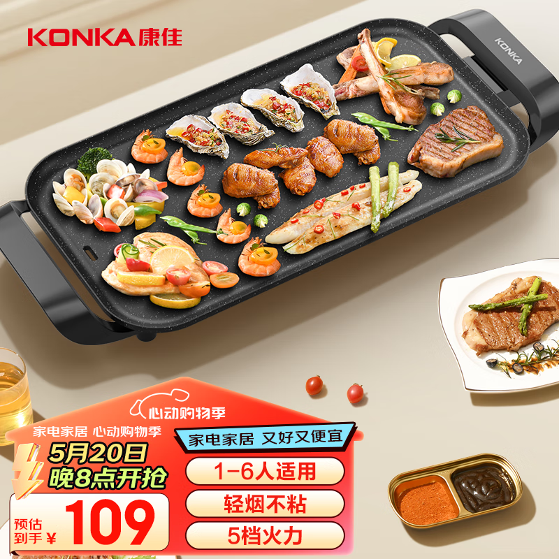 康佳(KONKA)电烤炉烤肉锅 家用多功能大功率轻油少烟大容量2-6人不粘电烤盘烤肉机 KDKP-1802-W价格:109.00元!
