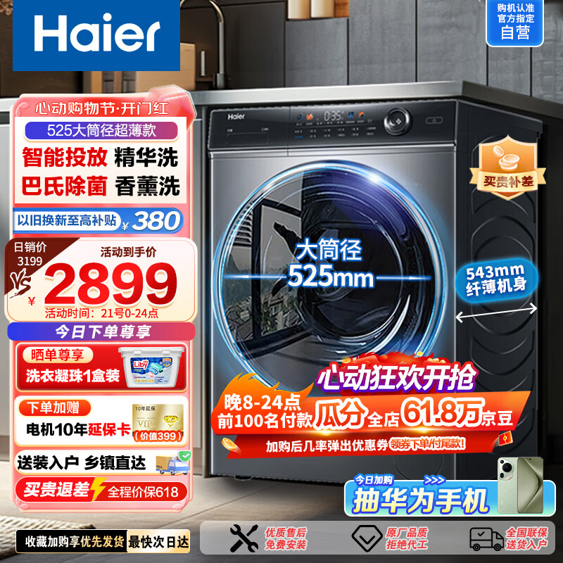 海尔(Haier)10KG全自动变频滚筒洗衣机 超薄家用大容量智能投放大筒径香薰除菌 精华洗省水电升级款 以旧换新价格:2899.00元!
